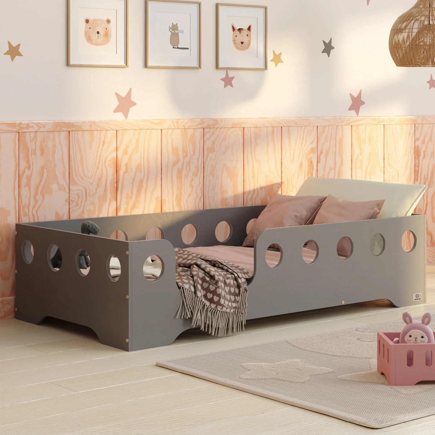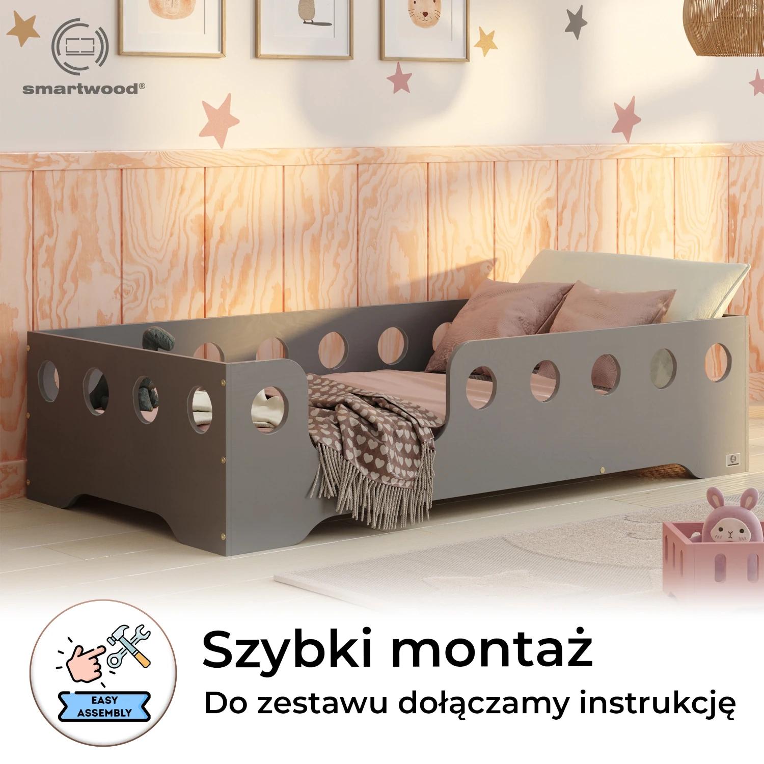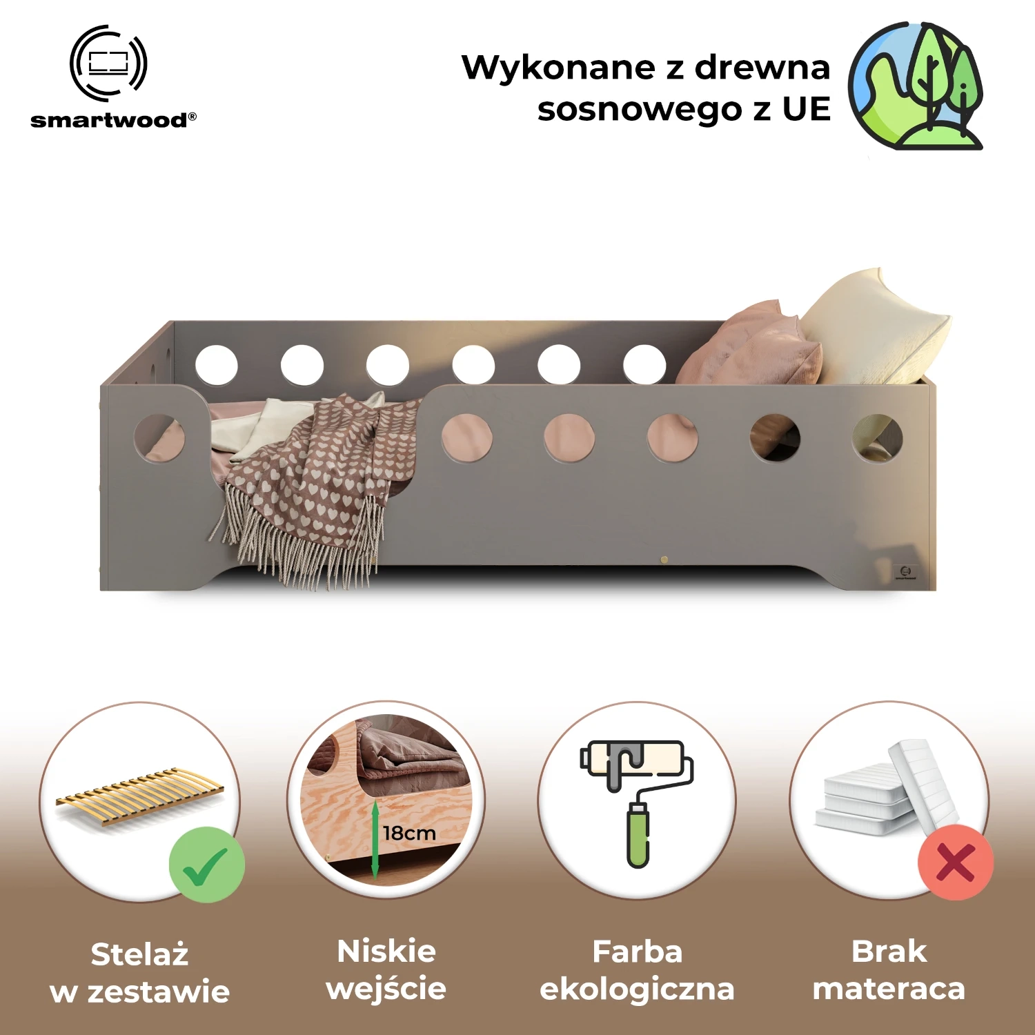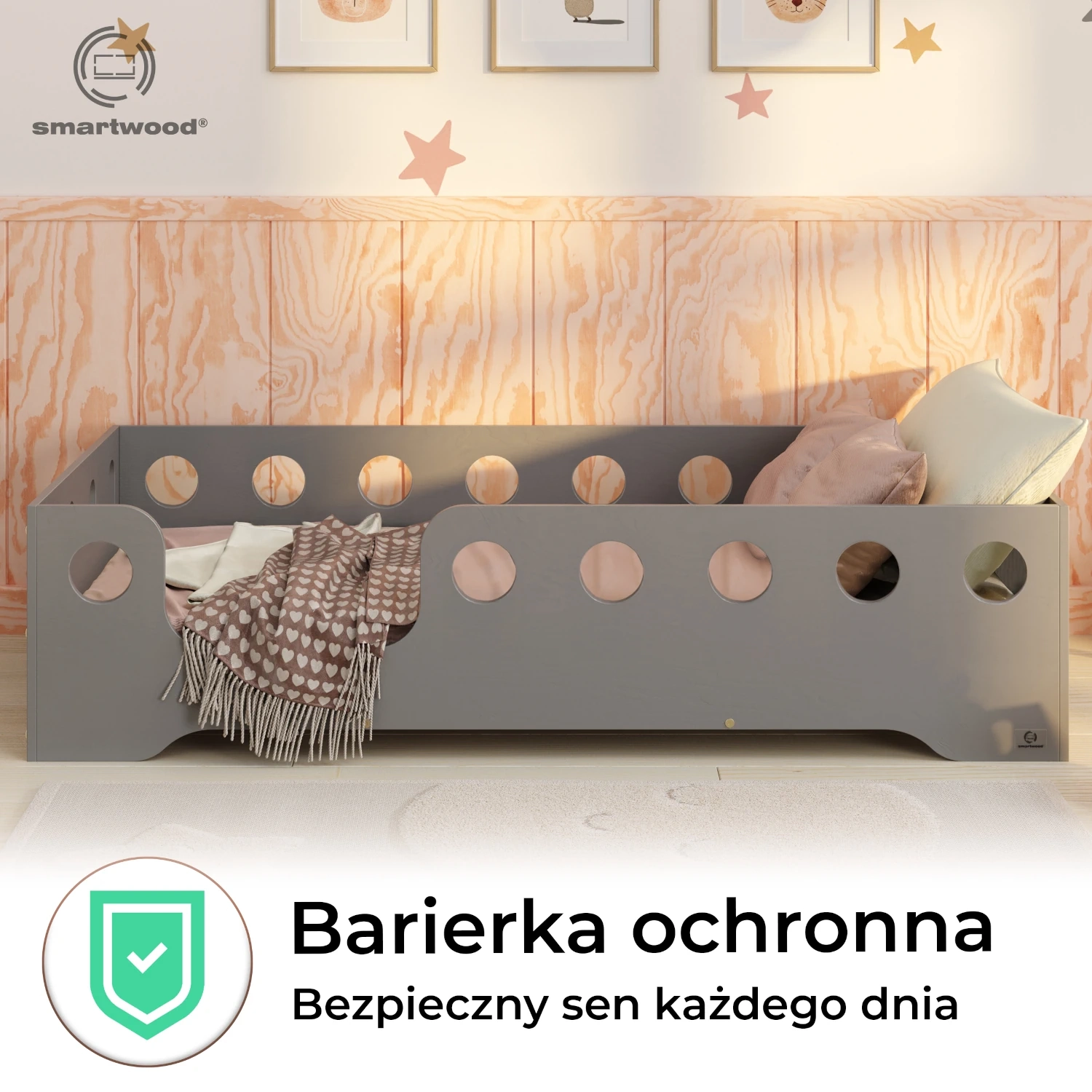 Łóżko pojedyncze dla dzieci z barierką i stelażem TILA 4 Montessori Drewniane