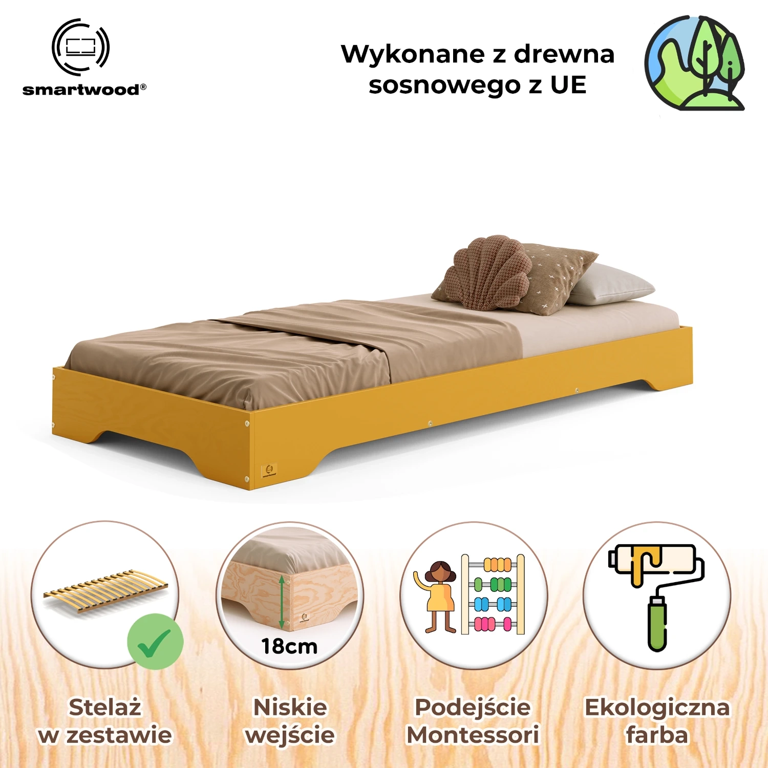 Łóżko pojedyncze dla dzieci podłogowe ze stelażem TILA 7 Montessori Drewniane