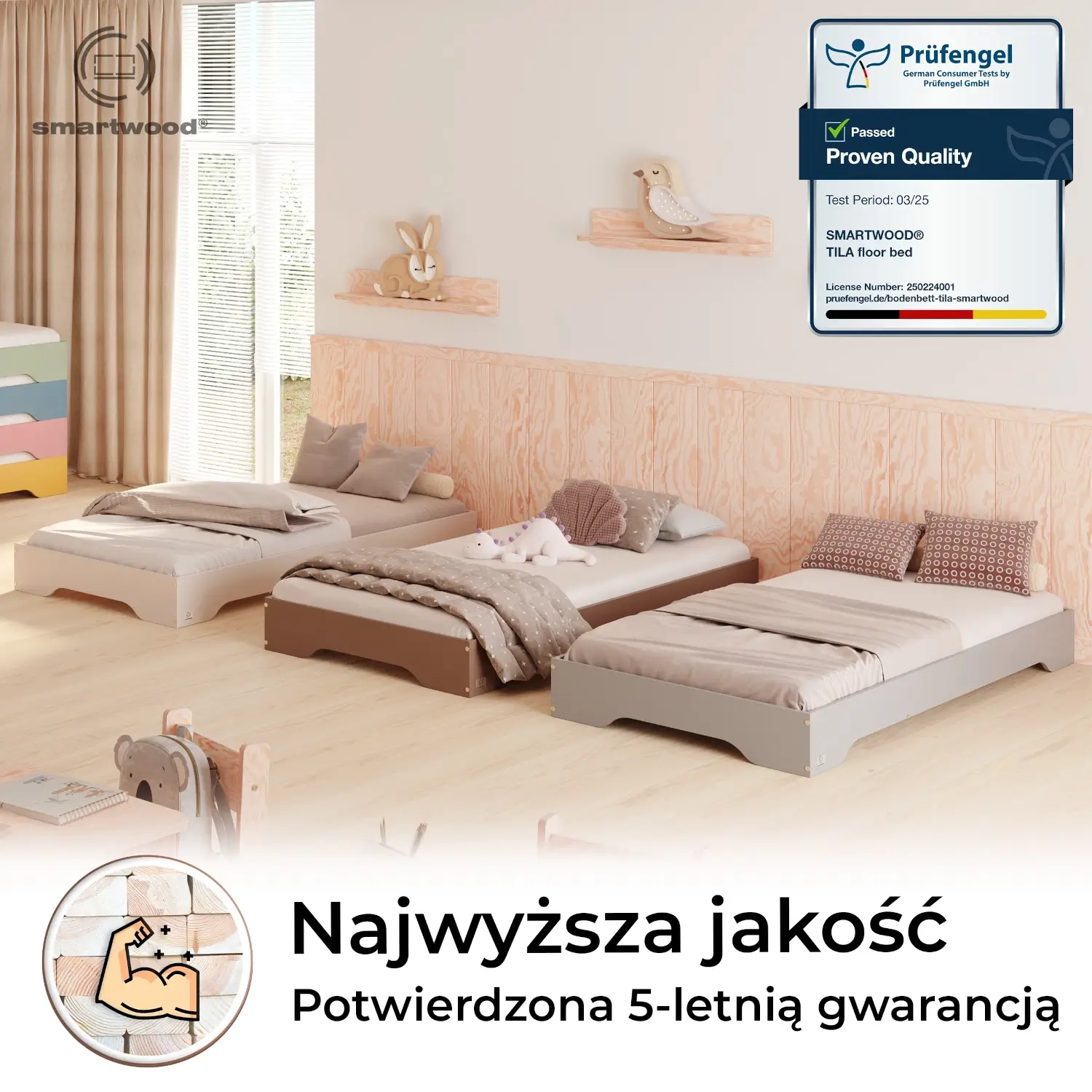 Łóżko pojedyncze TILA 7 zostało zaprojektowane w duchu filozofii Montessori, wspierając samodzielność i rozwój Twojego dziecka. Niskie łóżko dla dziecka umożliwia łatwe wchodzenie i schodzenie, co pomaga najmłodszym rozwijać niezależność już od pierwszych lat życia. Wykonane z wysokiej jakości sklejki sosnowej, dostępne w 11 kolorach i 23 rozmiarach, dzięki czemu pasuje do każdego wnętrza, oferując zarówno funkcjonalność, jak i estetykę. Gładkie, zaokrąglone krawędzie eliminują ryzyko urazów, zapewniając pełen komfort i bezpieczeństwo potwierdzone certyfikatem prestiżowego niemieckiego Instytutu Prüfengel. Dołączony w zestawie stelaż, o max. obciążeniu do 300 kg, sprawia, że łóżko jest gotowe do użytku od razu po złożeniu.