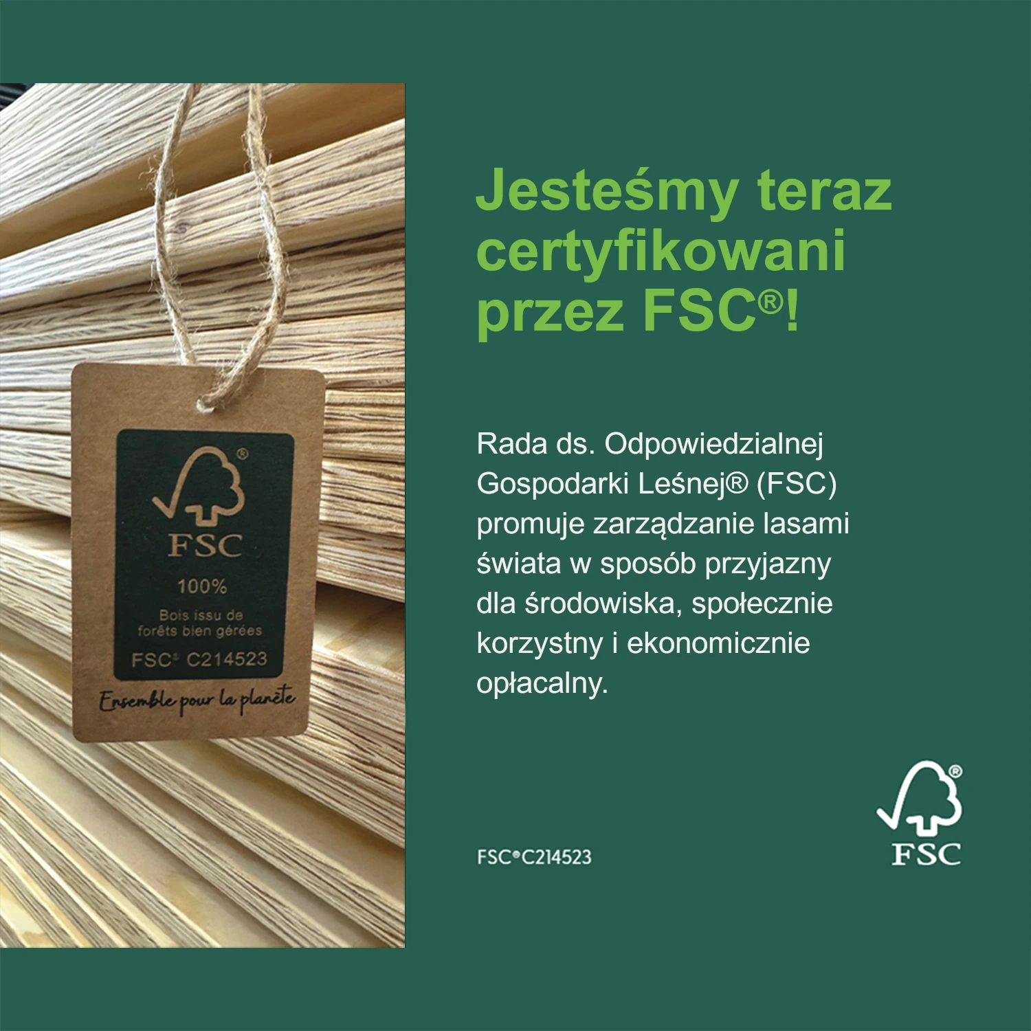 Materiał wykorzystywany do produkcji produktów to sklejka sosnowa o grubości 15 mm. Jest to sklejka o klasie 1/2, co świadczy o wysokiej jakości tego materiału. Naturalne drewno powinno przemawiać do Was klientów ceniących ekologię. Jedną z istotnych cech materiału jest pozyskiwanie go z lasów objętych certyfikatem FSC. Certyfikat potwierdza, że drewno pochodzi z zrównoważonych źródeł, co wpisuje się w troskę o ochronę środowiska.
