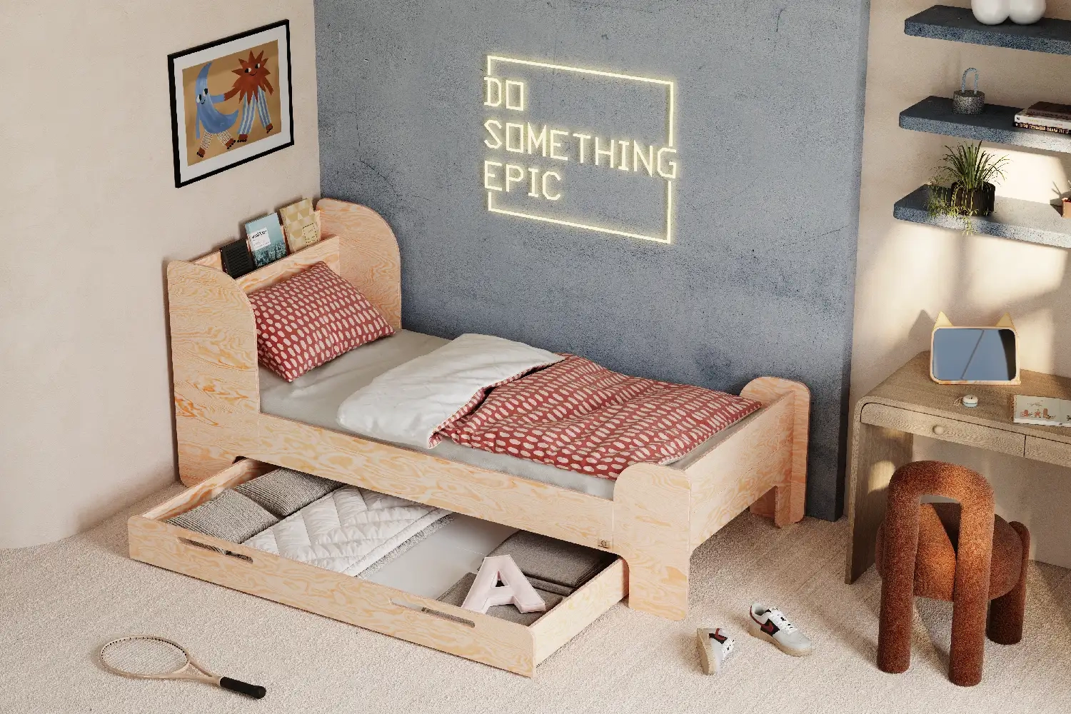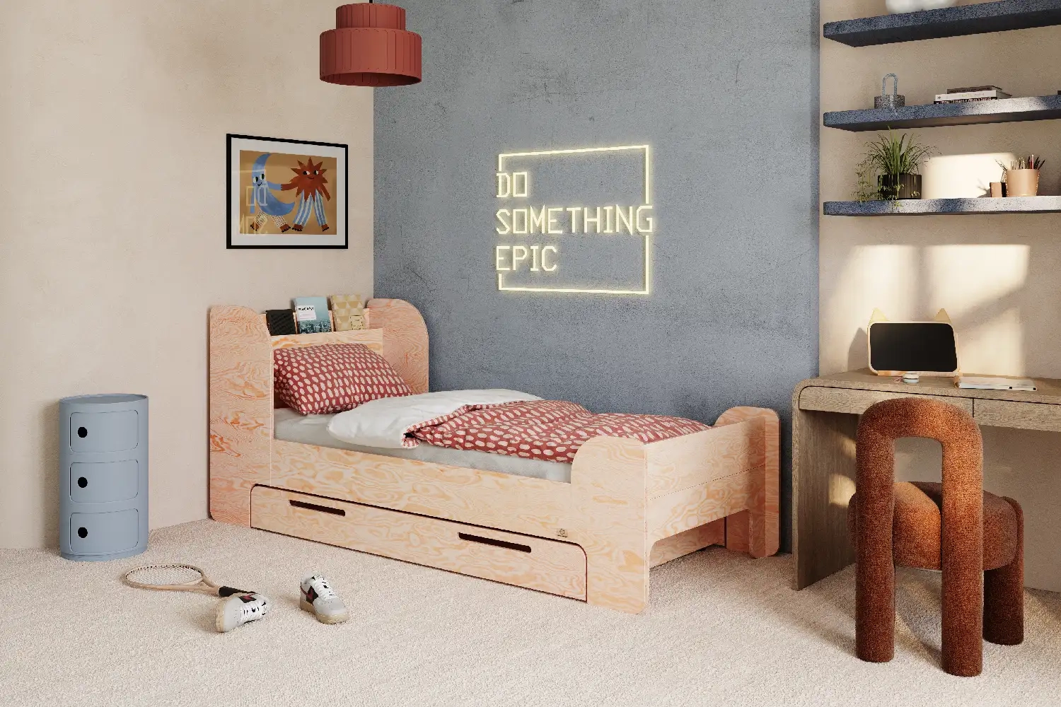 Masz dość nudnych mebli? Nasze łóżko to połączenie solidnej sklejki sosnowej z młodzieżowym vibe’em. Gładkie, zaokrąglone krawędzie chronią przed otarciami, a stonowana estetyka wpasuje się w każdy nastoletni pokój.