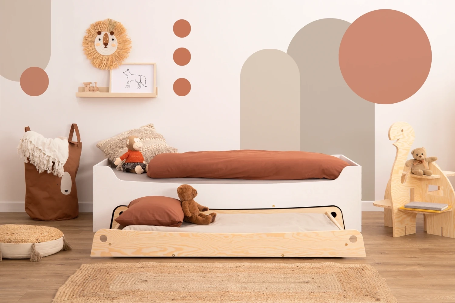 Starannie zaprojektowana konstrukcja łóżka łączy trwałość z wyjątkowym wyglądem. Delikatnie zaokrąglone i gładkie krawędzie gwarantują pełne bezpieczeństwo, a jednocześnie nadają meblowi elegancji, która doskonale wpasuje się w wystrój dziecięcego pokoju.