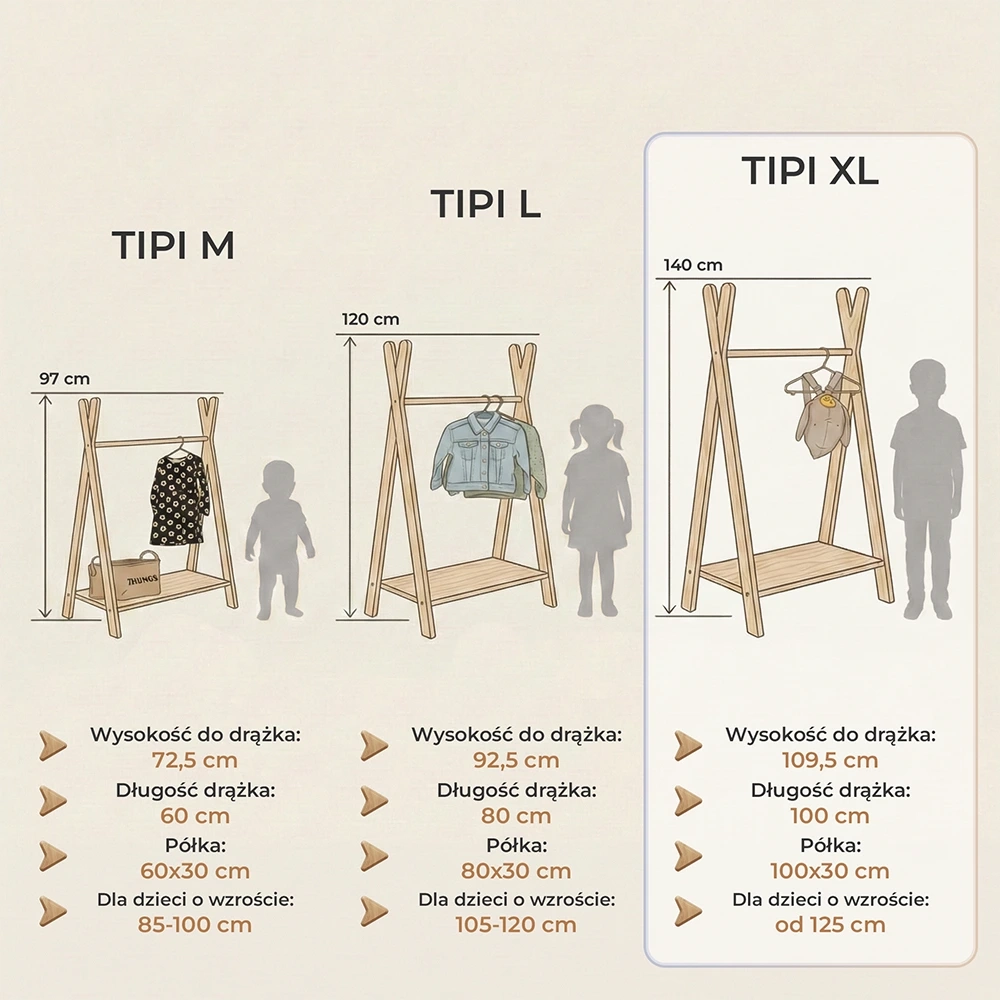 Mali ludzie potrzebują odpowiedniego wieszaka dla swoich małych ubrań - jest to oczywiste. Mając to na uwadze, zaprojektowaliśmy serię wieszaków, które przede wszystkim są przystępne i poręczne dla najmłodszych członków rodziny ;) Buty lub inne akcesoria schowasz pod podstawką lub położysz na jej wierzchu, a poziomy pałąk utrzyma na sobie całą gamę wieszaków. Nawet wierzchołki nóżek nadadzą się na zawieszenie czapki czy też ulubionych wisiorków. Ponad to - świetny styl oraz estetyka wykonania - są tylko niektórymi z zalet wieszaka TIPI, który dostępny jest w trzech rozmiarach.