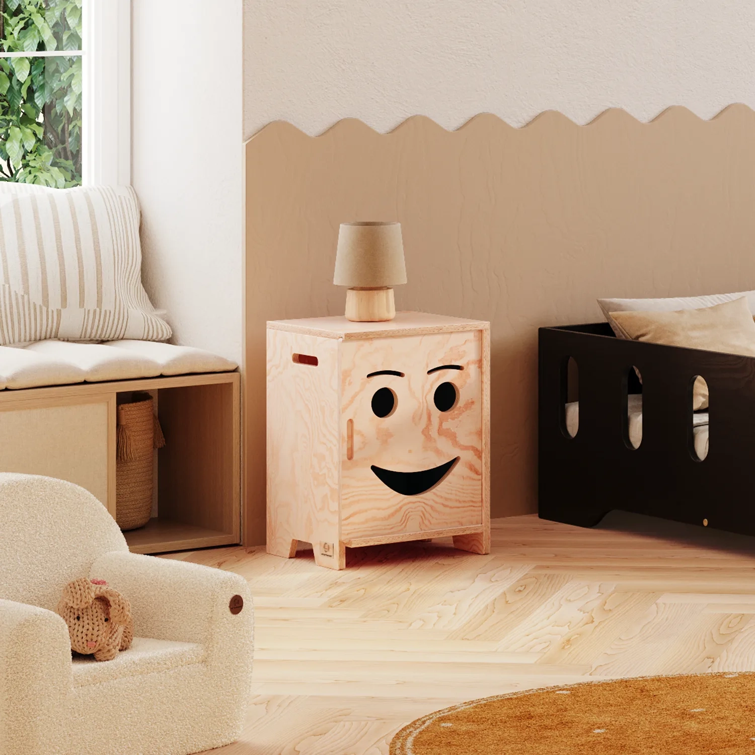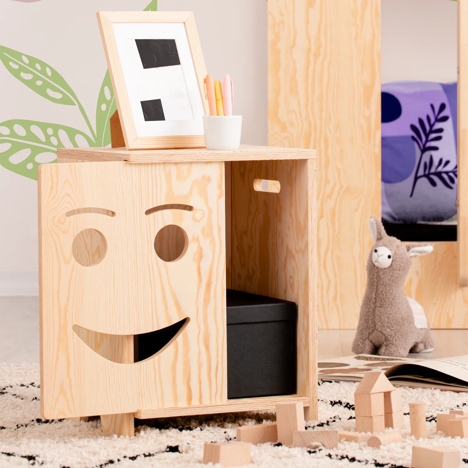 Szafka nocna KAPI to idealne połączenie praktyczności i uroku, stworzone z myślą o najmłodszych. Wykonana z wysokiej jakości sklejki sosnowej, charakteryzuje się solidną konstrukcją i gładkimi, zaokrąglonymi krawędziami, zapewniającymi bezpieczeństwo podczas użytkowania. Unikalnym elementem są przesuwne drzwiczki z wyciętymi, uśmiechniętymi buźkami, dodające meblowi charakteru i zachęcają dzieci do samodzielnego korzystania. Szafka dostępna jest w 3 różnych wersjach oraz 11 kolorach, co pozwala na dopasowanie do każdej aranżacji pokoju. Kompaktowe wymiary sprawiają, że doskonale sprawdzi się jako miejsce do przechowywania ulubionych zabawek, książeczek czy innych skarbów Twojego dziecka, jednocześnie ucząc je organizacji i porządku.